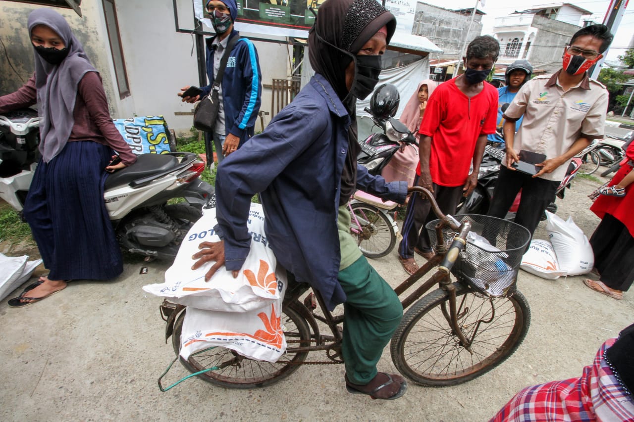 Warga Keluarga Penerima Manfaat (KPM) membawa pulang Bantuan Sosial Beras (BSB) saat pembagian di Desa Keude Aceh, Lhokseumawe, Aceh, Selasa (7/10/2020). Foto: ANTARA FOTO/Rahmad