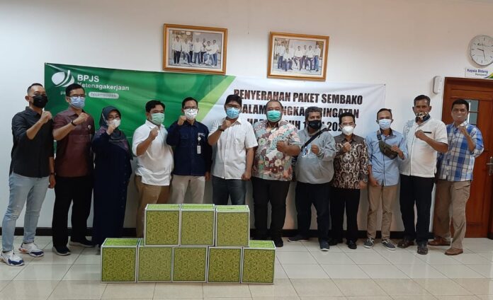 Pimpinan BPJamsostek diwakili oleh salah satu kepala bidang, Bapak supriatna yang menyerahkan secara simbolis bantuan sembako kepada tiap organisasi dan Disnaker. ***Andi M.Rosul***