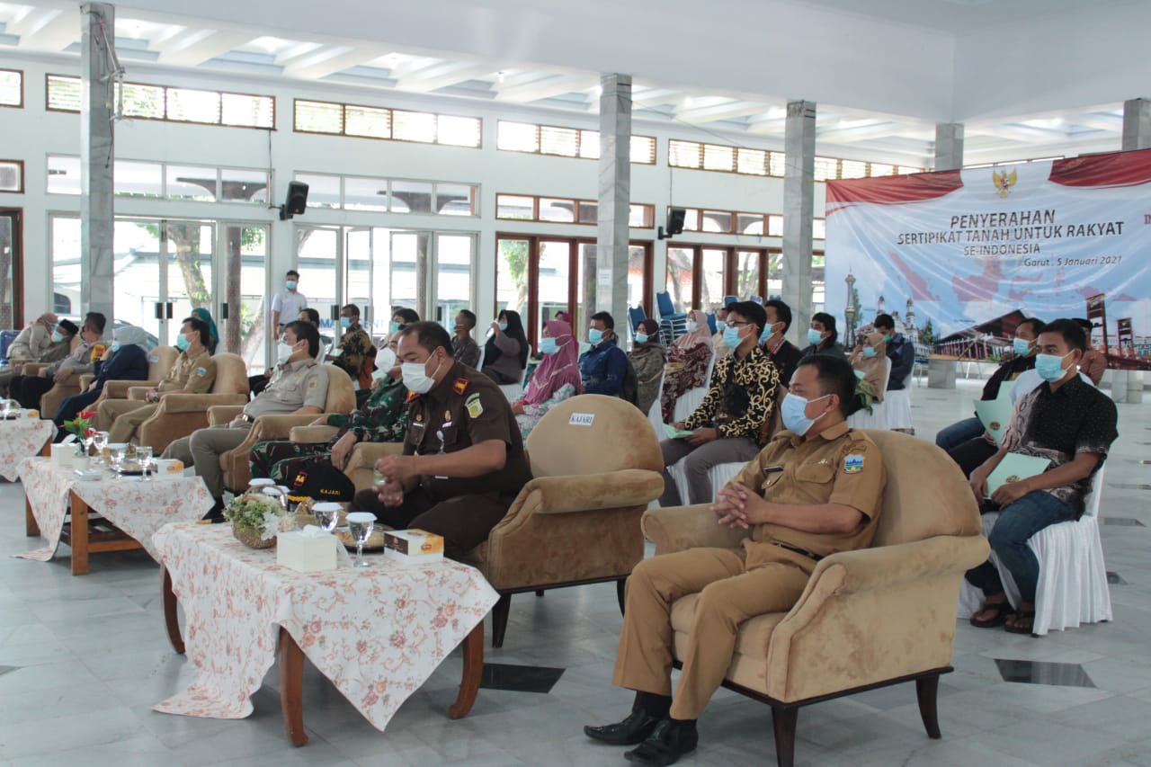 GARUT,koran-samudra.com – BPN (Badan Pertanahan Nasional) Kabupaten Garut membagikan 5000 bidang sertipikat tanah melalui program PTSL (Pendaftaran Tanah Sistematis Lengkap) secara simbolis kepada 30 orang perwakilan masyarakat di Gedung Pendopo, Kecamatan Garut Kota, Kabupaten Garut, Selasa (5/1/2021).