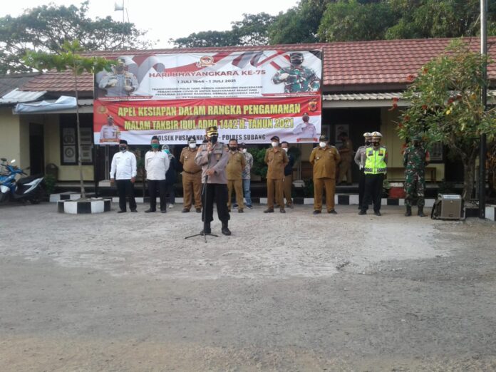 Kepolisian Sektor Pusakanagara, Koramil 0511 Pusakanagara bersama gabungan Muspika Kecamatan Pusakanagara dan Kecamatan Pusakajaya, laksanakan apel kesiapan pengamanan malam Hari Raya Idul Adha 1442 Hijriyah, di halaman mapolsek Pusakanagara, senin sore (19/07/2021).