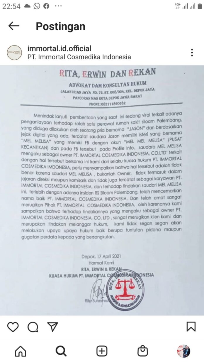 Menanggapi isu yang beredar di media sosial saat ini tentang kasus pemukulan salah satu perawat di Palembang dimana pelaku mengatasnamakan Owner / Pemilik PT. Immortal cosmedika Indonesia di akun facebook miliknya dengan nama “Mel Melisa”.