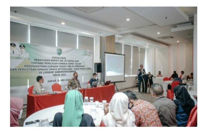 Subang, Koran Samudra.Com. Sekretaris Daerah (Sekda) Kabupaten Subang H. Asep Nuroni S.Sos, M.Si membuka sosialisasi Peraturan Bupati Subang Nomor 44 tahun 2020 tentang Penilaian Kinerja Camat dalam meningkatkan pencapaian target Pajak Bumi Bangunan (PBB) Perdesaan dan perkotaan sebagai upaya optimalisasi tugas pokok camat di Kabupaten Subang. Pelaksanaan kegiatan di Ruang Rapat Sawala Fave Hotel jalan Kapten Hanafiah Subang, Jumat (28/5/2021).