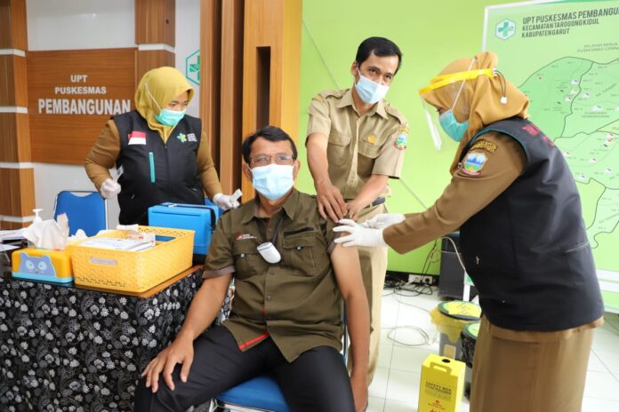 GARUT,koran-samudra.com – Wakil Bupati Garut, dr. Helmi Budiman menjalani vaksinasi Covie-19 tahap kedua di Puskesmas Pembangunan, Kecamatan Tarogong Kidul, Kabupaten Garut, Senin (15/2/2021).